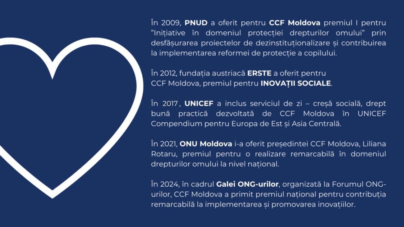 CCF Moldova creează pentru copiii în nevoie un mediu de speranţă şi respect, în care îşi pot dezvolta potenţialul complet şi oferă instrumente practice pentru o schimbare pozitivă în viaţa copilului, familiei şi comunităţii.