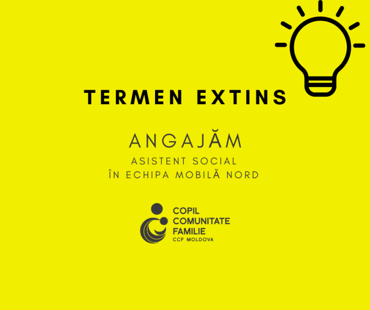 CCF Moldova – copil, comunitate, familie, anunță concurs de angajare în poziția de asistent social în echipa mobilă din nord pentru raioanele: Dondușeni, Drochia, Edineț și altele. Căutăm o persoană motivată care să se alăture echipei noastre în munca pentru copii. Acest rol presupune o colaborare activă cu Autoritățile Publice Locale pentru reformarea sistemului rezidențial de îngrijire a copilului.