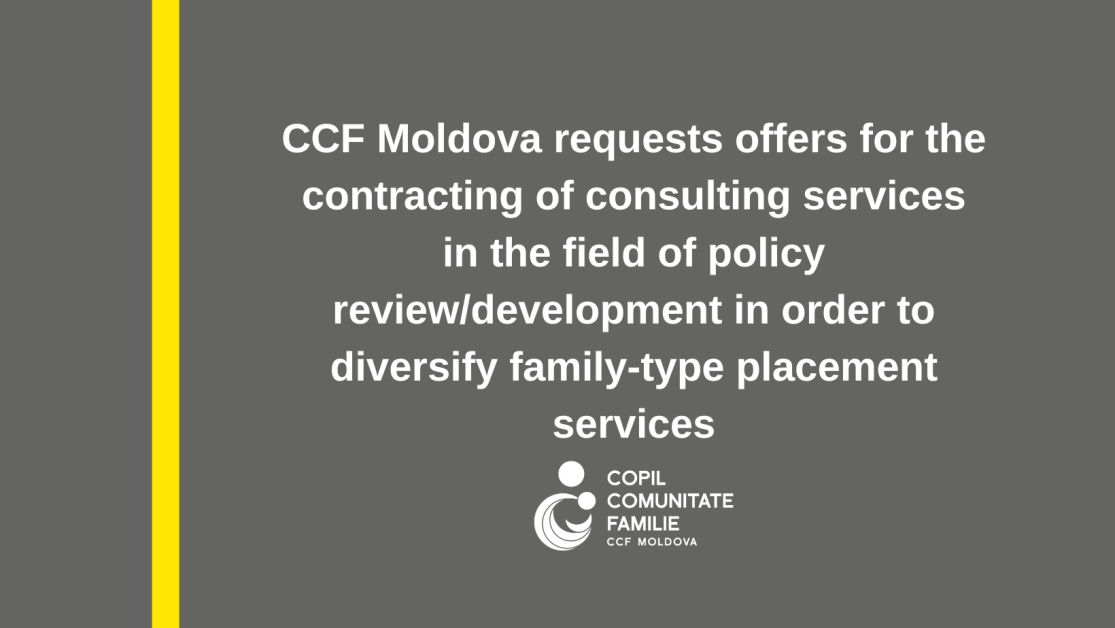 In the context of achieving the general objective of ensuring a family environment of care for children separated from their families or at risk of separation, prioritizing the most vulnerable groups of children: children with disabilities, children with health problems, young children, but also others groups of children, CCF Moldova requests offers for the contracting of consulting services in the field of policy review/development in order to diversify family-type placement services. Both national and international consultants can participate, individually or in consortium.