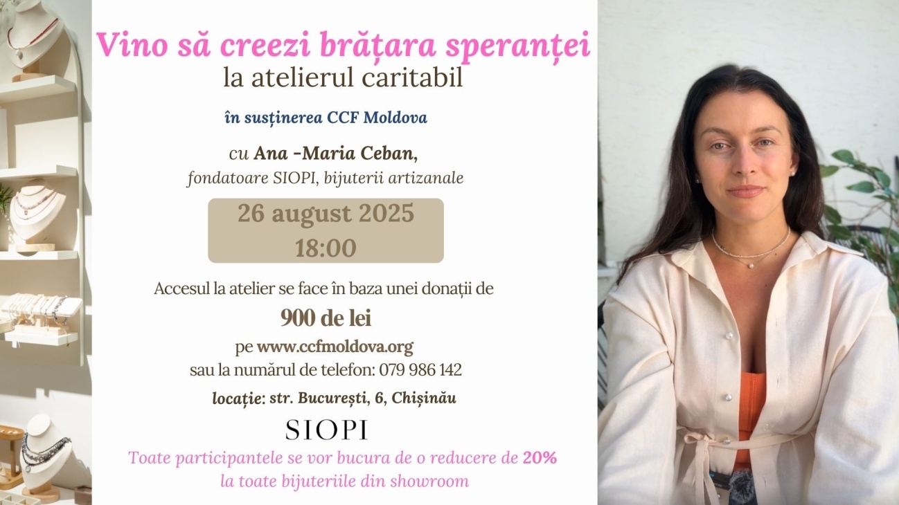 De ziua sa, Ana-Maria Ceban, fondatoarea SIOPI și specialistă în bijuterii artizanale, transformă sărbătoarea într-un dar pentru copii. Te invităm să participi la Atelierul aniversar „Brățara Speranței”, un eveniment caritabil dedicat sprijinirii copiilor în risc de separare din programele CCF Moldova.
