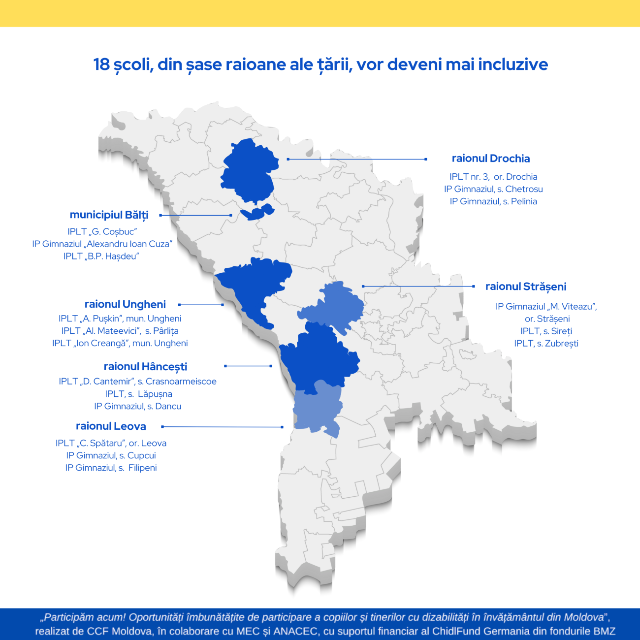 A fost finalizat procesul de selectare a celor 18 școli, care vor deveni mai incluzive, în cadrul proiectului „Participăm acum! Îmbunătățirea oportunităților de participare a copiilor și tinerilor cu dizabilități în sistemul de educație din Republica Moldova”. 140 de școli din 28 de raioane au participat la concursul național, anunțat după demararea proiectului, iar dosarele au fost depuse la Centrul Republican de Asistență Psihopedagogică din municipiul Chișinău, fiind analizate în baza criteriilor stabilite împreună cu partenerii CCF Moldova, și anume: specialiștii MEC, CRAP și ANACEC.