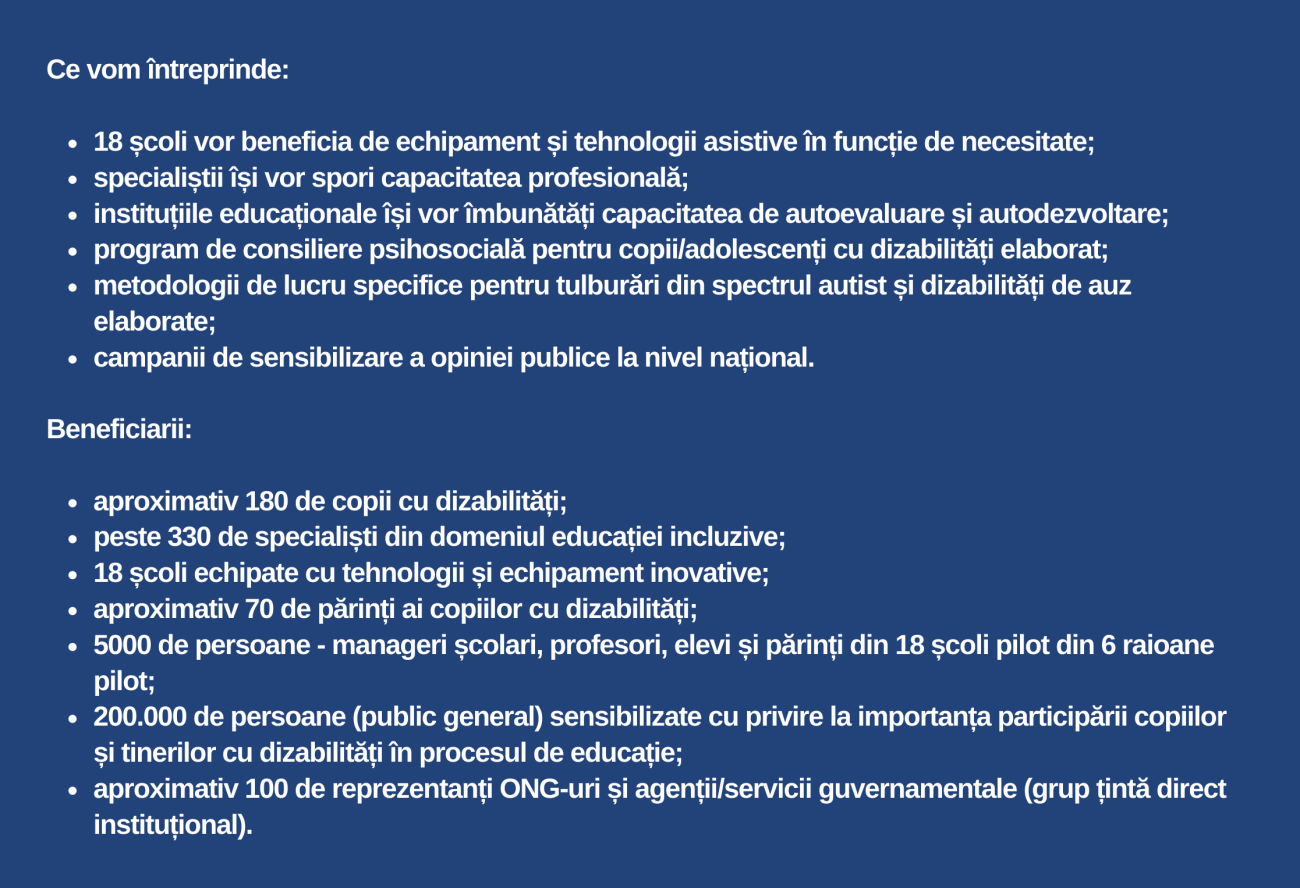Acțiunea este parte a proiectului „Participăm acum! Îmbunătățirea oportunităților de participare a copiilor și tinerilor cu dizabilități în sistemul de educație din Republica Moldova”. Oportunitățile vor fi îmbunătățite prin adaptări de mediu și echiparea sălilor sau grădinilor senzoriale, prin elaborarea a două metodologii pentru copiii și tinerii cu dizabilități de auz și pentru copii și tinerii cu tulburări din spectrul autist, iar elaborarea unui program de consiliere psiho-socială este unul dintre obiectivele proiectului.