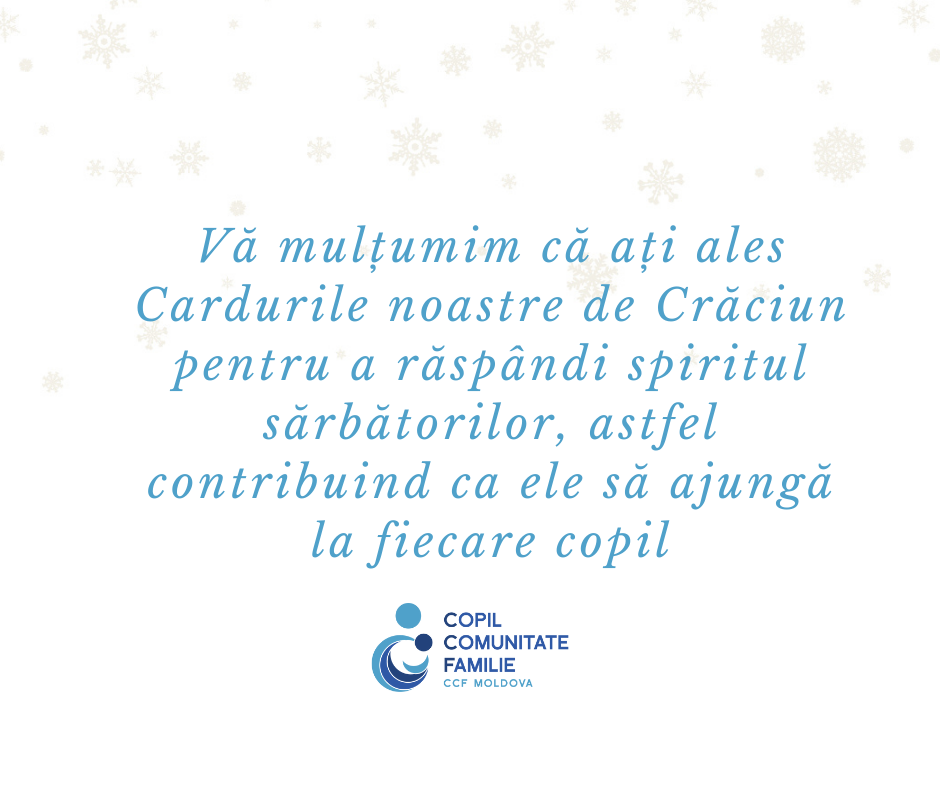 Le suntem recunoscători tuturor participanților în campanie, atât persoanelor fizice, cât și companiilor care au ales să dăruiască celor dragi carduri poștale pictate manual, astfel contribuind la bunăstarea copiilor în risc de separare. Împreună, am adus mai multă lumină și bucurie în lume, astfel Crăciunul a devenit mai frumos, mai plin de sens, iar fiecare card vândut ne-a amintit că darurile cele mai de preț sunt cele care vin din inimă.